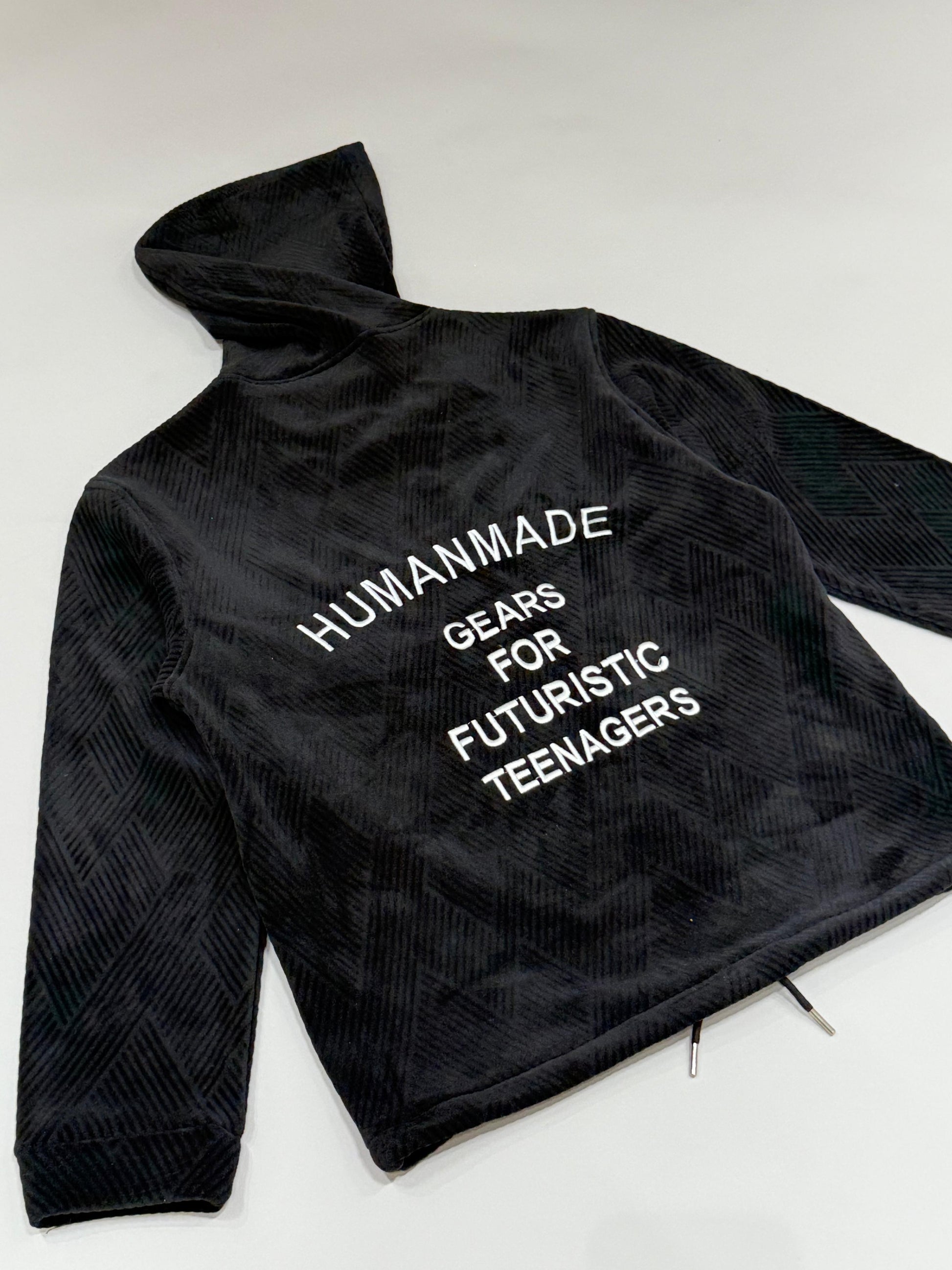 A black velvet bonded hoodie with a soft, plush texture and “HUMANMADE — GEARS FOR FUTURISTIC TEENAGERS” printed on the back.